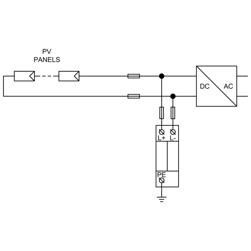 U -yhteys: PV DC -piirien tavanomainen suojaustopologia.