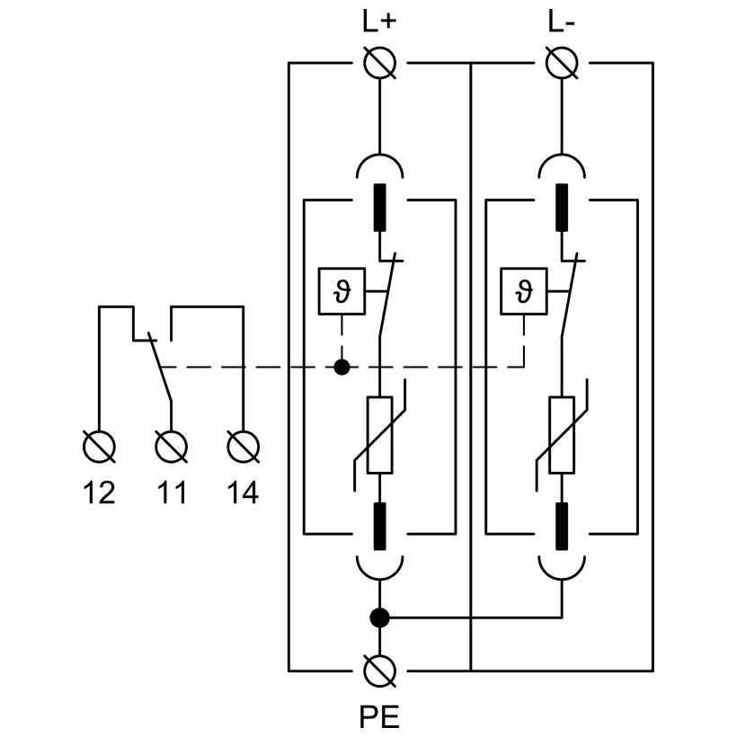 Erityiset varistorisektorit L+: n, L- ja PE: n välillä on kukin sisäisillä lämmön irrottajilla. Kun varistori saavuttaa elämän lopun (ylikuumenee), katkaisin matkustaa, mikä osoittaa näkyvästi vian ja keskeyttää tasavirtavirran. Erityisen rakentamisensa ansiosta nämä pidättäjät voidaan asentaa ilman erillistä varakuljetta (järjestelmän koordinaation mukaan).